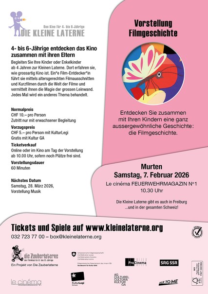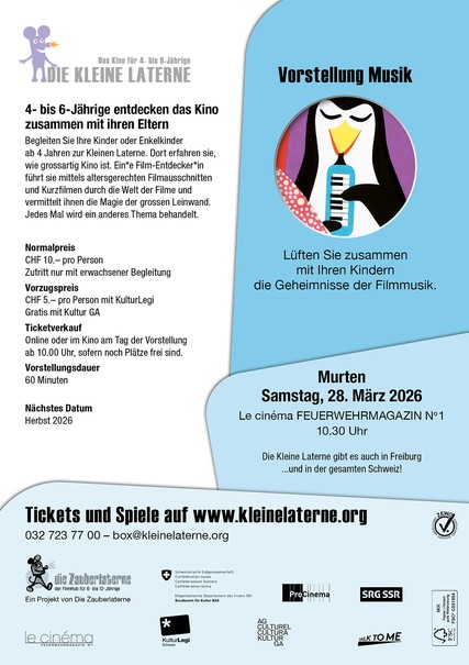 Die ganz Kleinen entdecken das Kino zusammen mit ihren Eltern. Begleiten Sie Ihre Kinder oder Enkelkinder ab 4 Jahren zur Kleinen Laterne, wo sie erleben, wie grossartig Kino ist. Ein/e "Film-Entdecker/in" führt sie mittels altersgerechten Filmausschnitten und Kurzfilmen durch die Welt des Kinos und vermittelt ihnen die Magie der grossen Leinwand. Jedes Mal wird ein anderes Thema behandelt. Am Samstag 28. März wird das Thema "Musik" angeschaut. Um Plätze zu reservieren, folgen Sie folgendem Link: https://www.kleinelaterne.org/kinos/murten